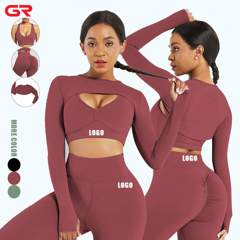 Women's Custom Logo 3-Piece Yoga Set High Waist Butt Lift Leggings Racerback Sports Bra Long Sleeve Top Print for Fitness